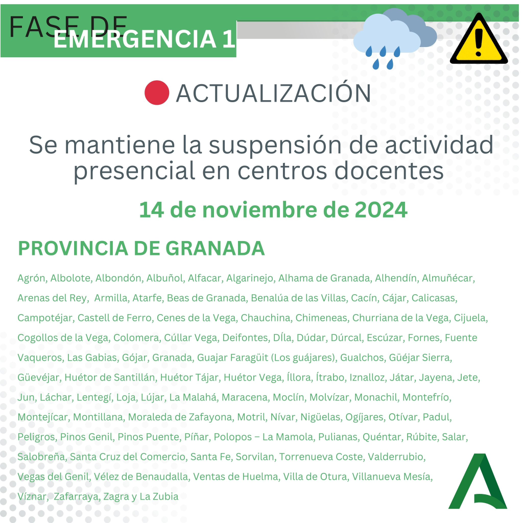 Ante los informes técnicos y permaneciendo la fase de emergencia situación operativa 1 del Plan de Emergencia ante el riesgo de inundaciones, se le comunica que mañana día 14 de noviembre de 2024 se mantiene suspendida la actividad presencial en nuestro centro educativo, por lo que no debe desplazarse al mismo. En caso de que la suspensión deba prolongarse más allá del día 14 se le comunicará por este mismo medio.